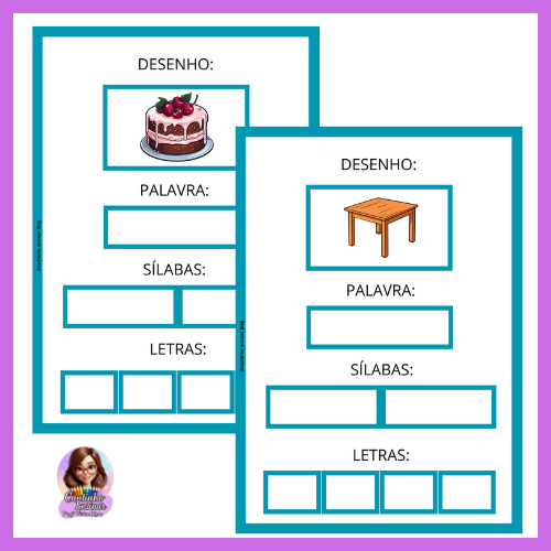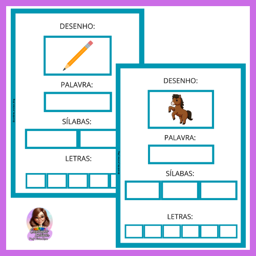 As fichas de escrita têm por objetivo provocar no aluno a consciência fonológica, uma vez que será levado a refletir sobre quais grafemas (letras) utilizar para produzir determinados sons (fonemas) nas palavras. A criança ao escrever os nomes das imagens, deverá posteriormente, fazer a separação silábica e em seguida completar os quadros com as letras da palavra.