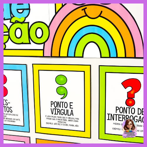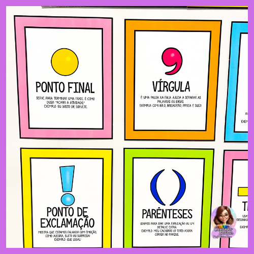 Com ilustrações fofas, cores vibrantes e explicações simples, o painel ajuda as crianças a entenderem para que serve cada sinal — do ponto final às aspas — estimulando a curiosidade e tornando a escrita muito mais divertida.